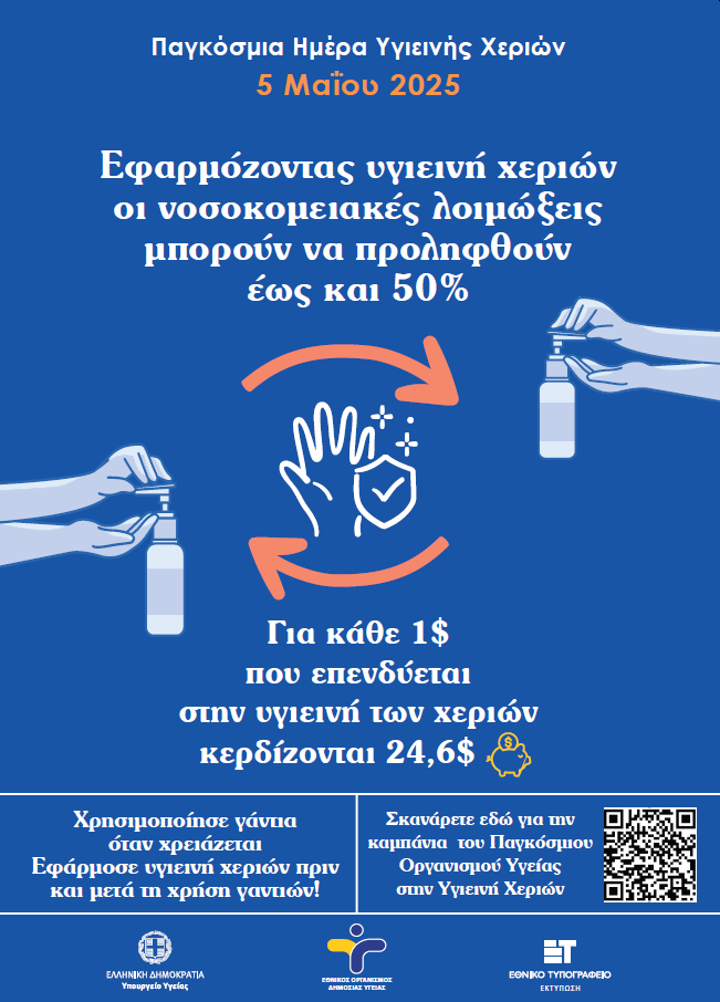 Με δεδομένη τη σημασία της Υγιεινής των Χεριών στην Πρόληψη και τον Έλεγχο των Λοιμώξεων, ο Παγκόσμιος Οργανισμός Υγείας (ΠΟΥ) έχει καθιερώσει από το 2008 την 5η Μαΐου ως Παγκόσμια Ημέρα της Υγιεινής Χεριών.